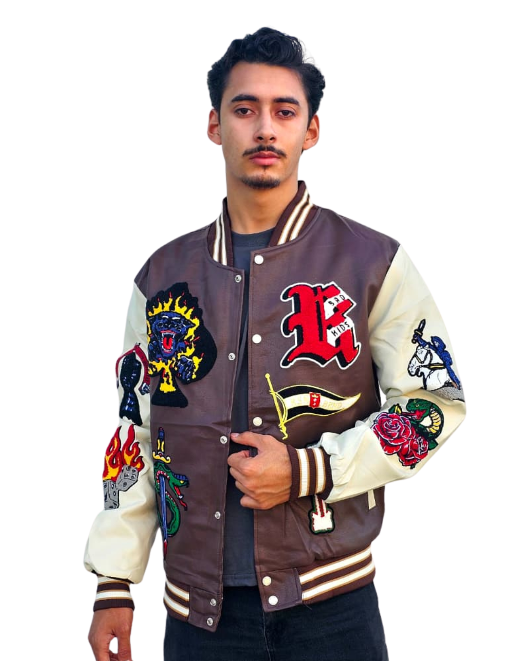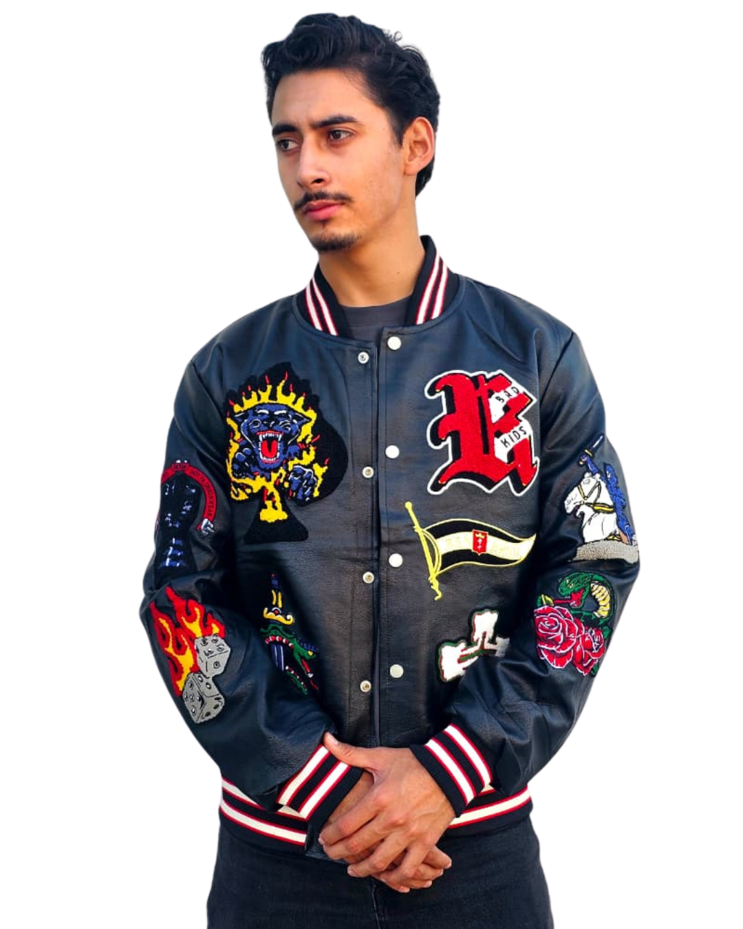 Chamarra de vinipiel bordada